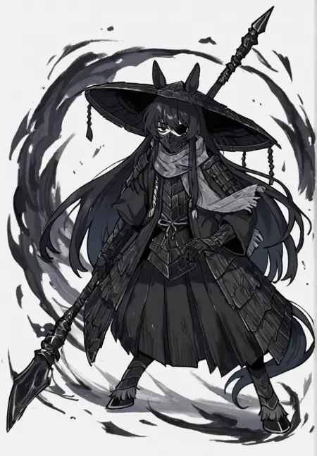イ・サンヘイショウ、長い髪、グレーのプリントスカーフ、黒いアイパッチ、装甲付きマウスマスク、黒いアジア式尖頭帽、黒ローブ、黒のプレート胸甲、黒ズボン、黒の腕甲、黒の脚甲、馬の耳、黒い馬の尾、装甲付き蹄