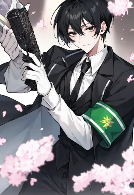 YiSangLament, hite shirt, black necktie, black vest, black coat, white gloves, black pants, green armband, holding gun, handgun, dual wielding