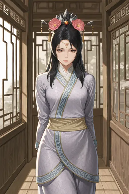 추천 양성 프롬프트: 1girl, solo, 검은 머리, 긴 머리, 머리 장식, 꽃 머리장식, 갈색 눈, 이마 무늬, 중국 복장, 긴 소매, 보라색 신발