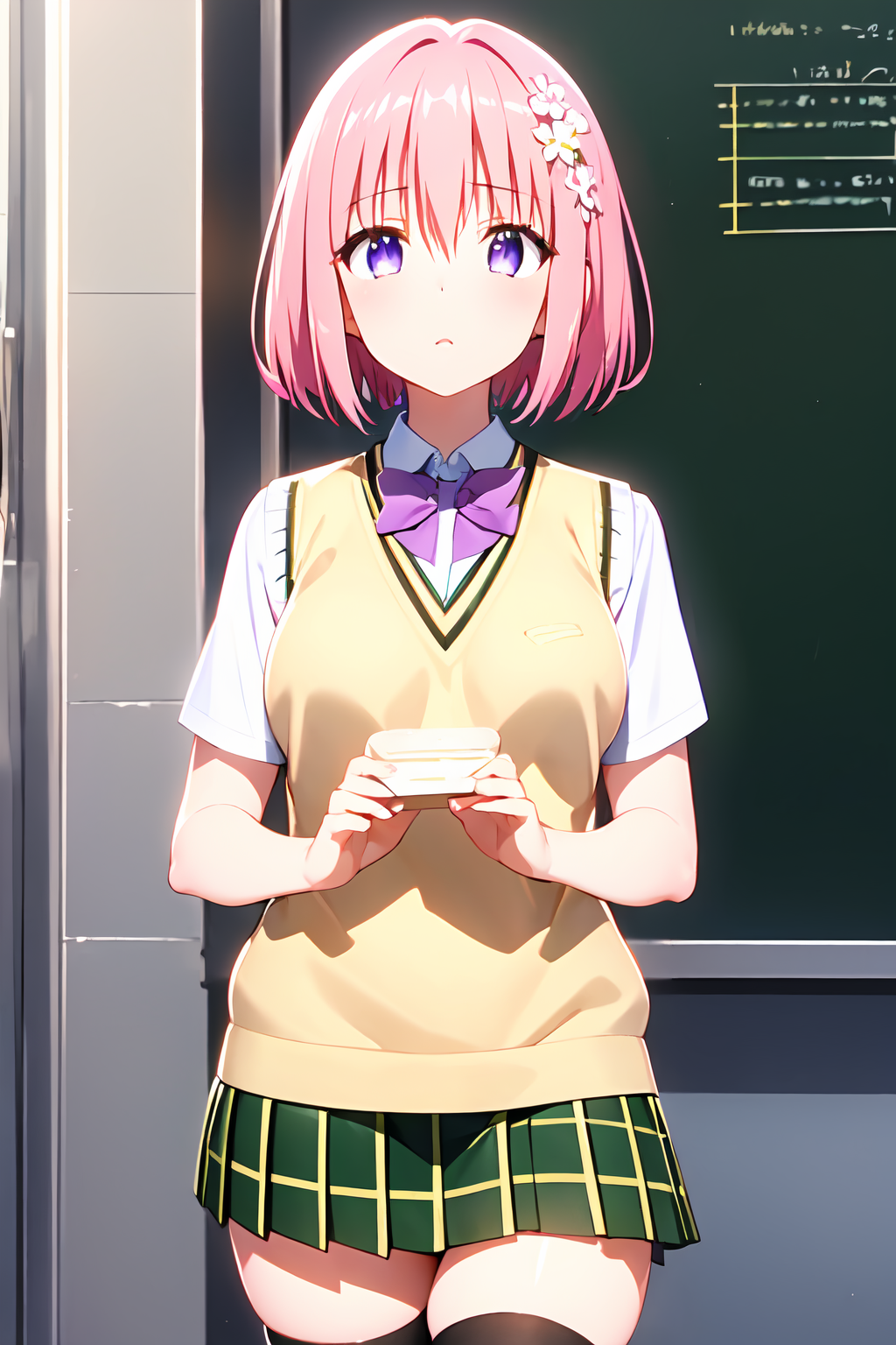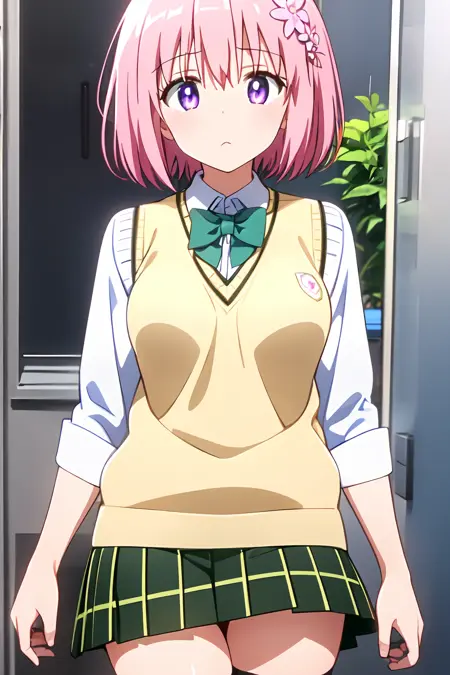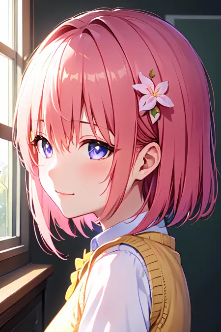 Full trigger words: ph momo, momohd, phmomo, solo, 1girl, pink hair, purple eyes, short hair, hair flower, sweater vest, school uniform, yellow sweater