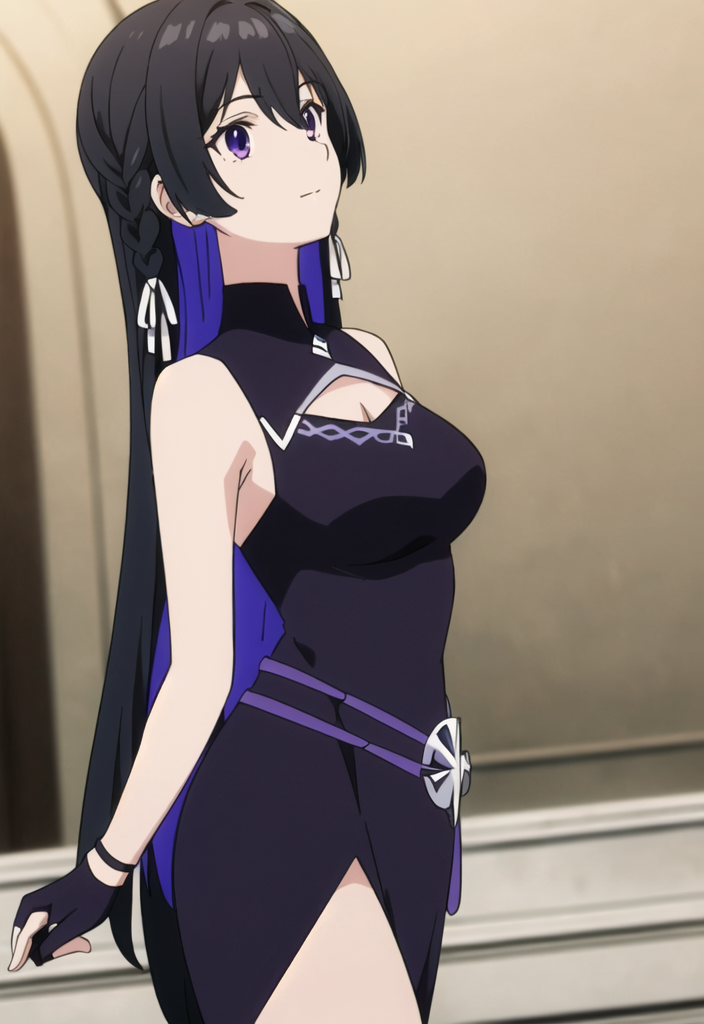 (colored_inner_hair,woman,black_sleeveless_dress,clothing_cutout,partially_fingerless_gloves,:1.1),