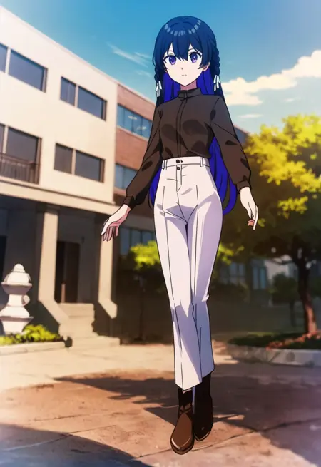 (colored_inner_hair,woman,dark_brown_baggy_clothes,white_pants,:1.1),