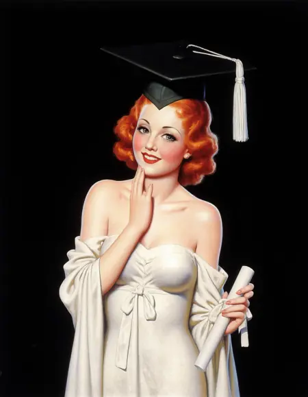 부드러운 곱슬머리를 가진 붉은 머리의 여자, 머리에 테이슬이 달린 졸업모와 드리워진 흰색 가운을 입고 말린 졸업장 한 장을 들고, 깊은 검은 배경을 배경으로 한 enoch-bolles 스타일의 일러스트