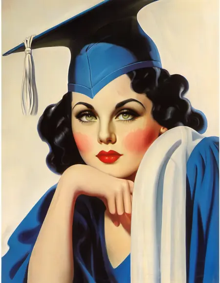 부드러운 곱슬머리를 가진 붉은 머리의 여자, 머리에 테이슬이 달린 졸업모와 드리워진 흰색 가운을 입고 말린 졸업장 한 장을 들고, 깊은 검은 배경을 배경으로 한 enoch-bolles 스타일의 일러스트