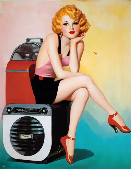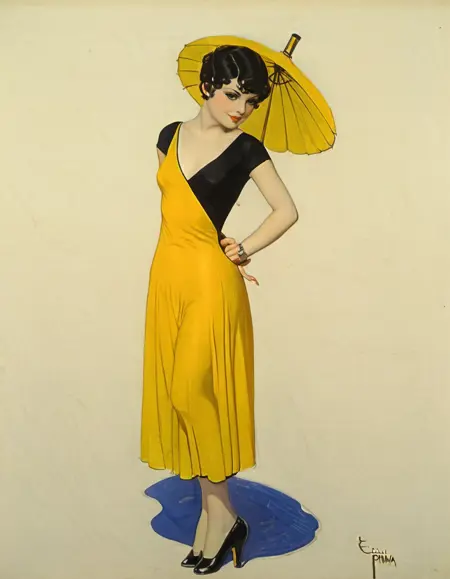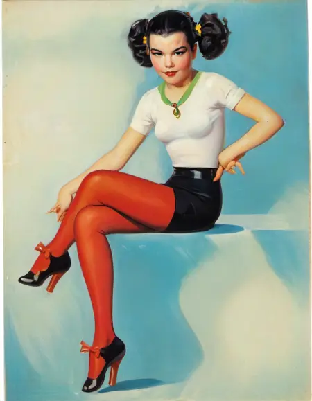 an illustration of a woman with curly blonde hair in a sleek red dress sitting and adjusting her yellow high heels, accentuated by black stockings, against a simple light blue background, the dress tied with a prominent yellow bow in the style of enoch-bolles
