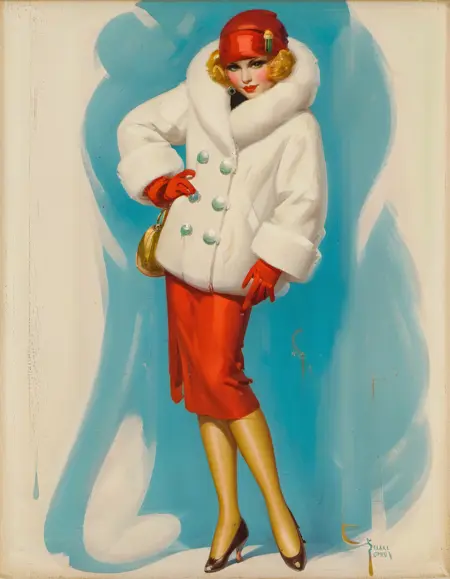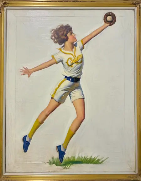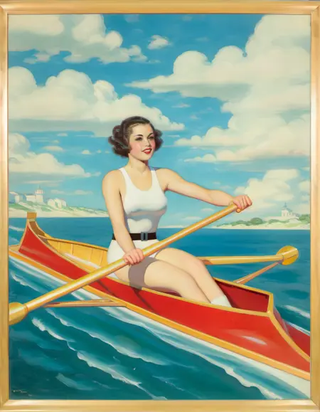 an illustration of a woman in a white swimsuit and large yellow hat sitting on a pink blanket in the style of enoch-bolles