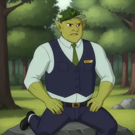 1boy, solo, BarnabasDingleknot, red eyes, pointy ears, green skin,