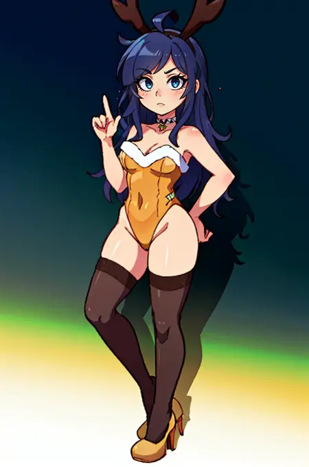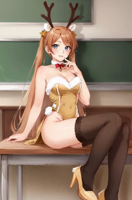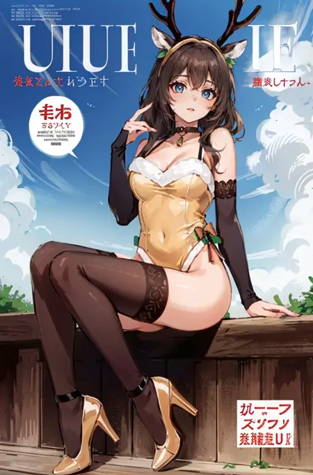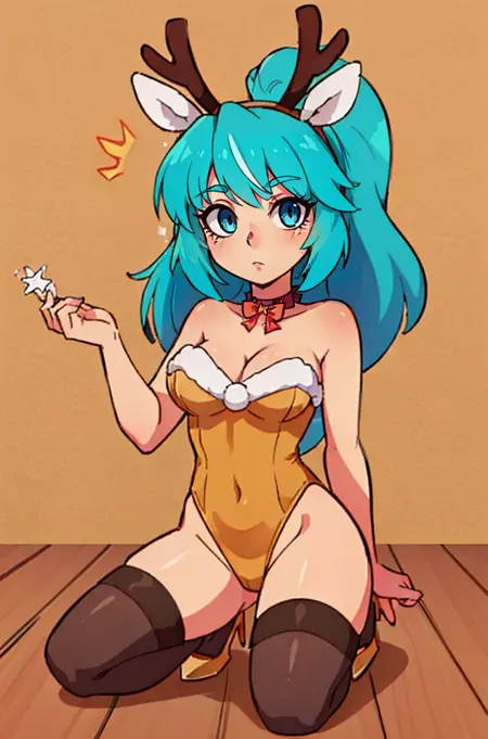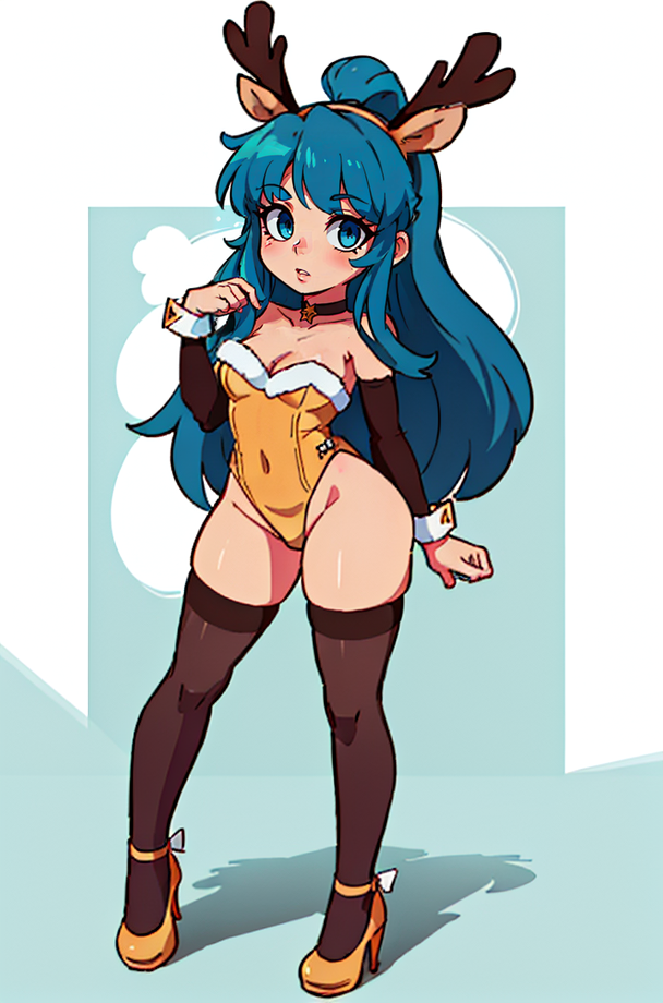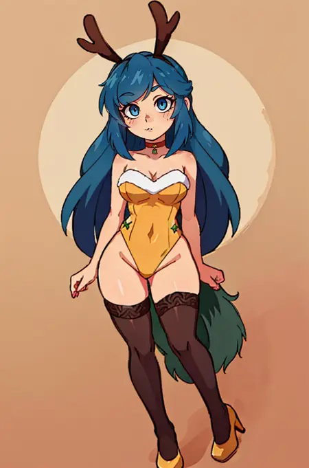 茶色のレオタード、スリムなストッキング、デューンメイク、鼻メイク、デューンの耳、トナカイの角、チョーカー、ハイヒール、仮の尻尾、ウエストアクセサリー