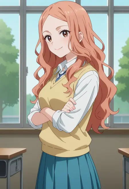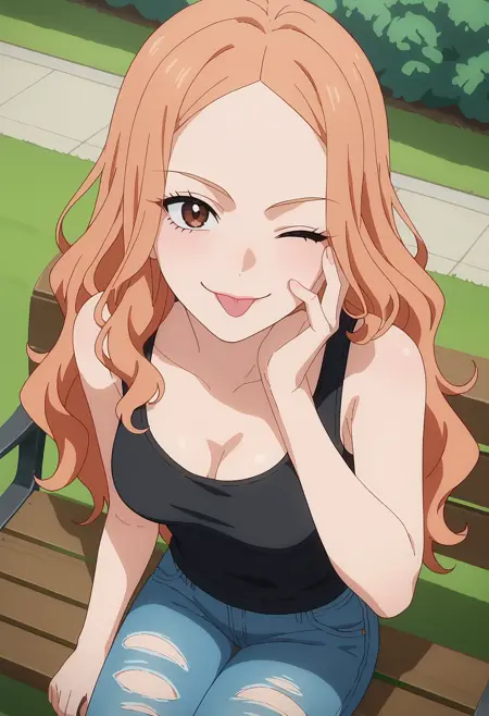 트리거: KJOrune, 복숭아색 머리, 진한 갈색 눈, 긴 머리, 중간 갈라진 앞머리, 물결 모양 머리, 반쯤 감은 눈