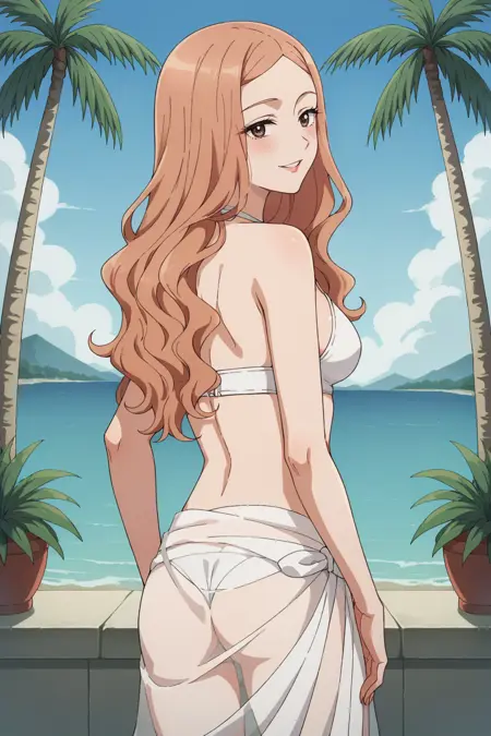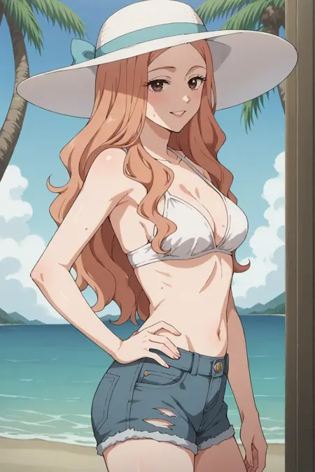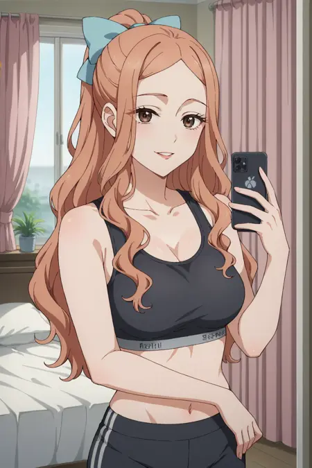 Triggers: KJOrune, peach hair, dark brown eyes, long hair, parted bangs, wavy hair, half-closed eyes,