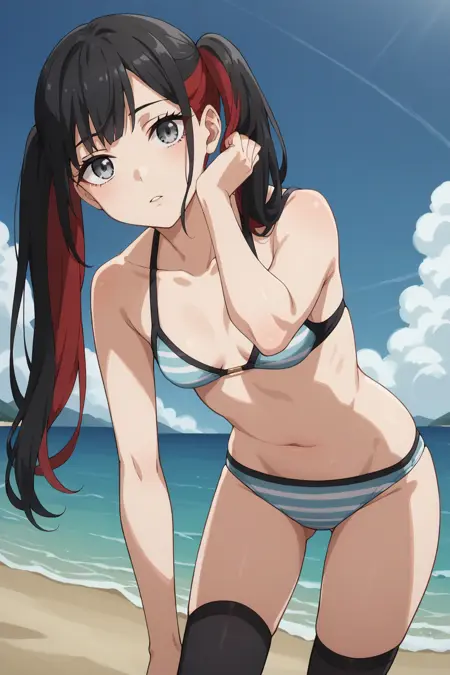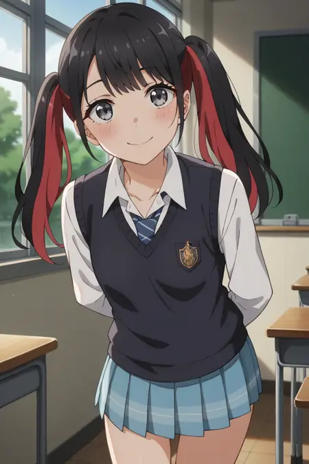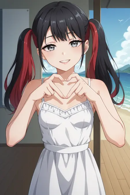 Triggers: KJOnowa, black hair, multicolored hair, grey eyes, bangs, twintails,