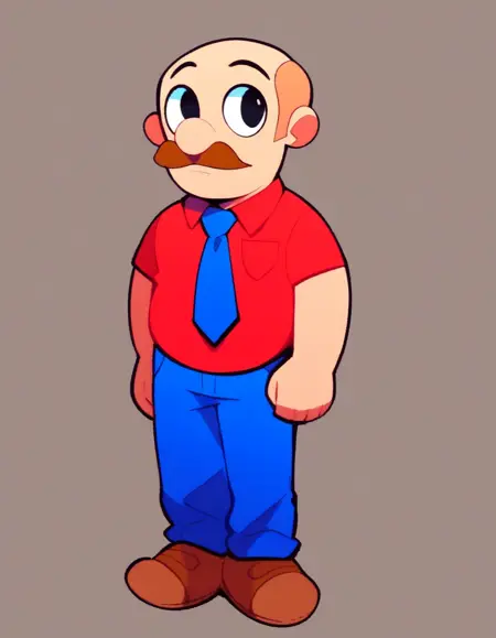 Marvin_SML, shirt, 1boy, necktie, pants, black eyes, facial hair, brown footwear, red shirt, mustache, bald, blue pants, brown shoes, blue neck tie, brown hair,