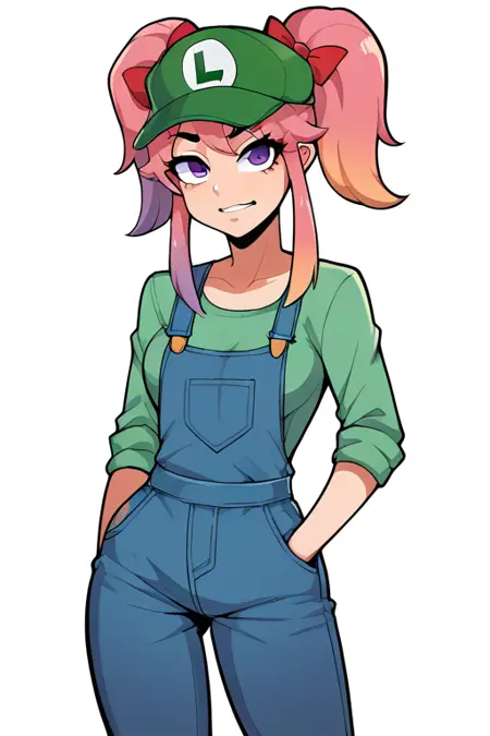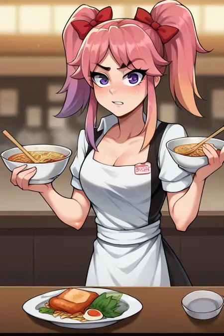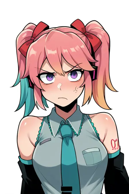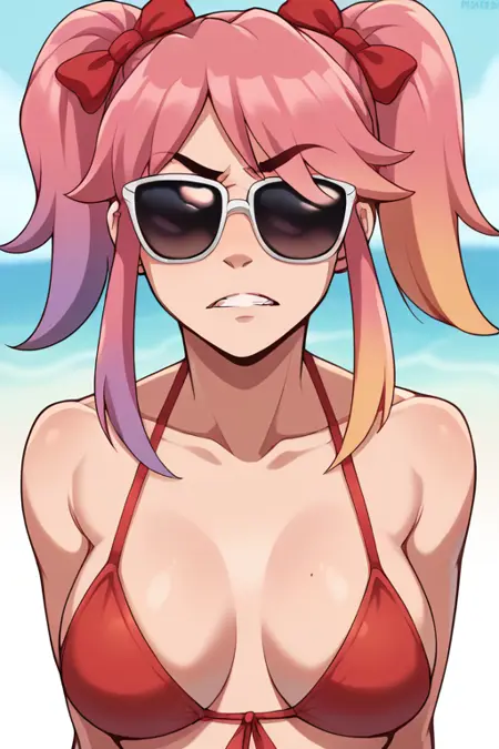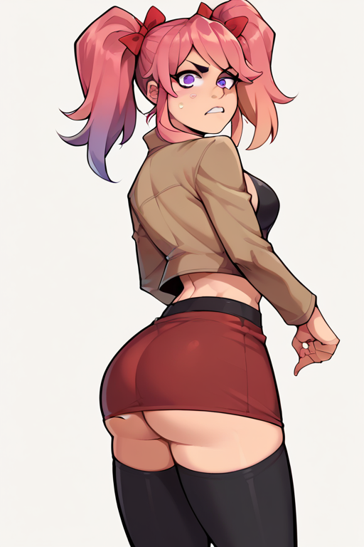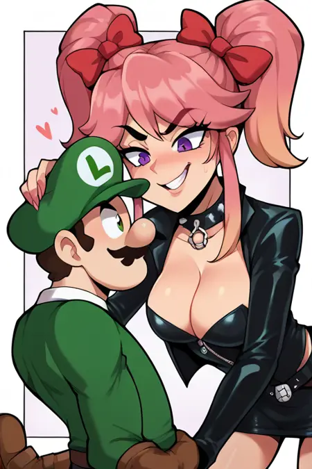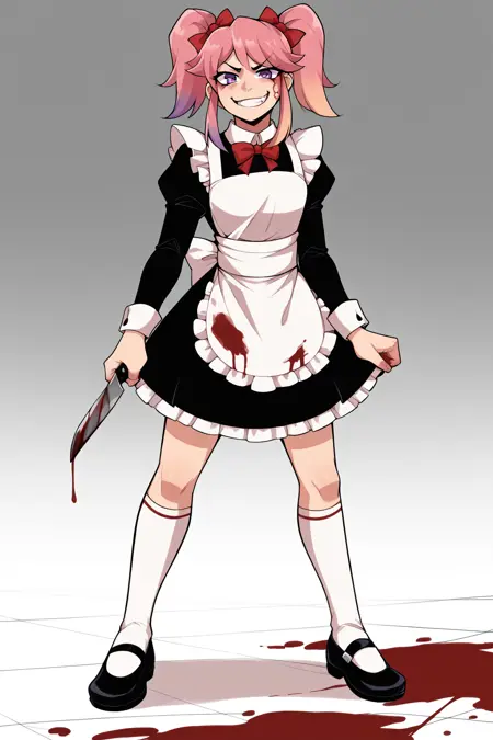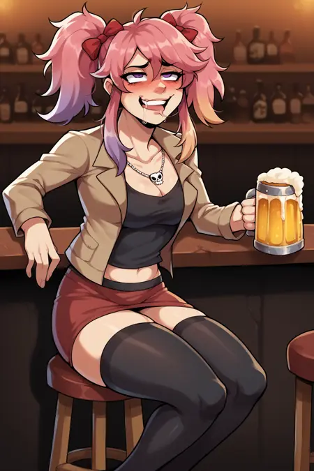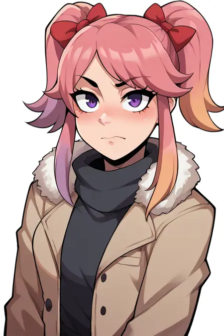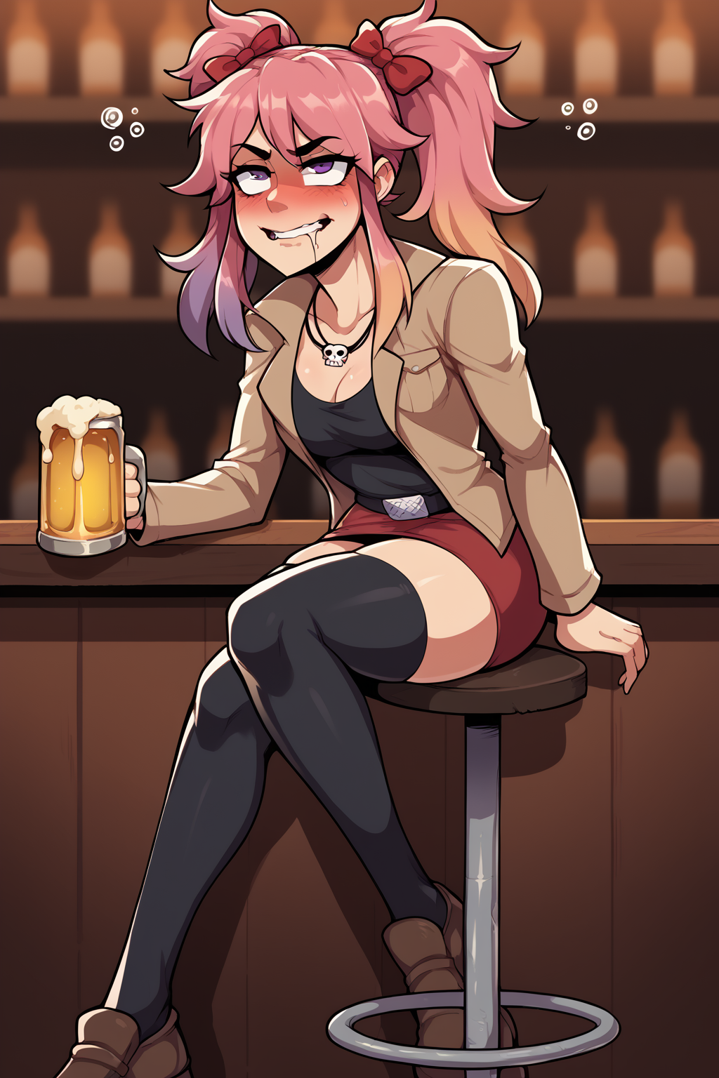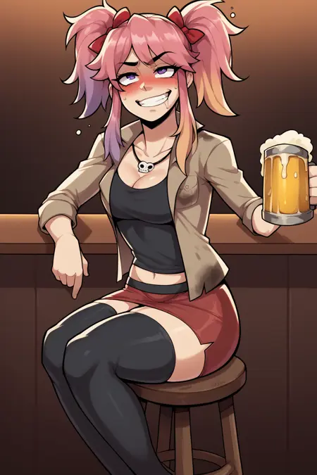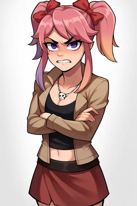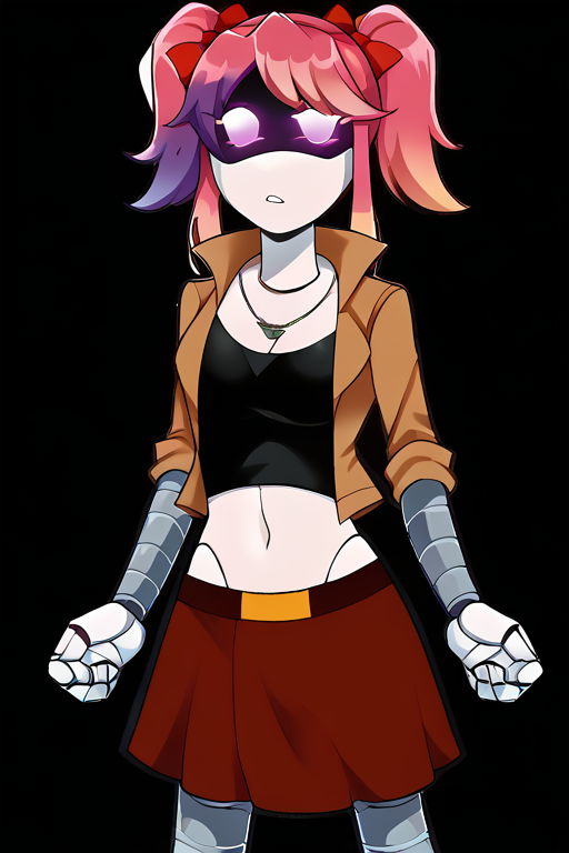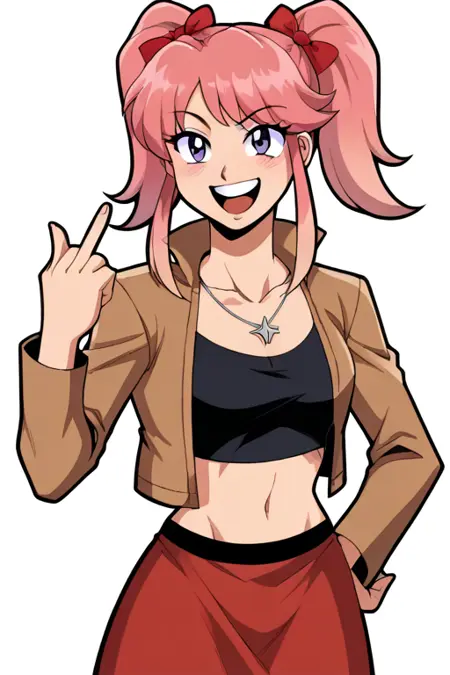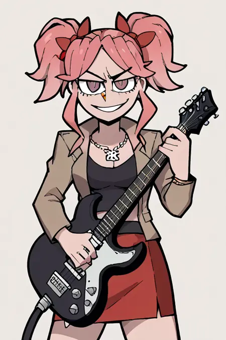 Saiko Bichitaru, Pink Hair, Purple Eyes, pigtails, red ribbons,brown jacket, black croptop, red skirt, skull necklace, black thighhighs, grey shoes,