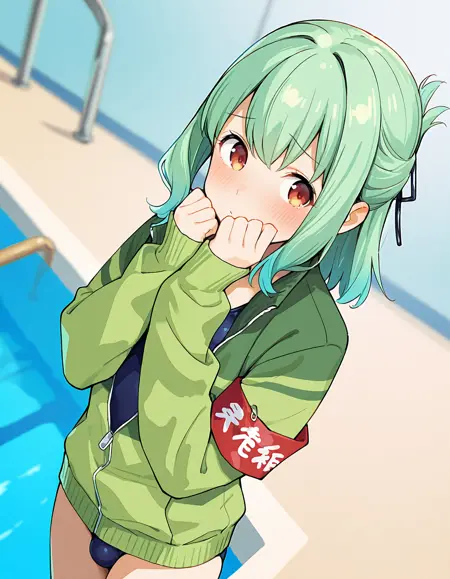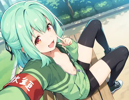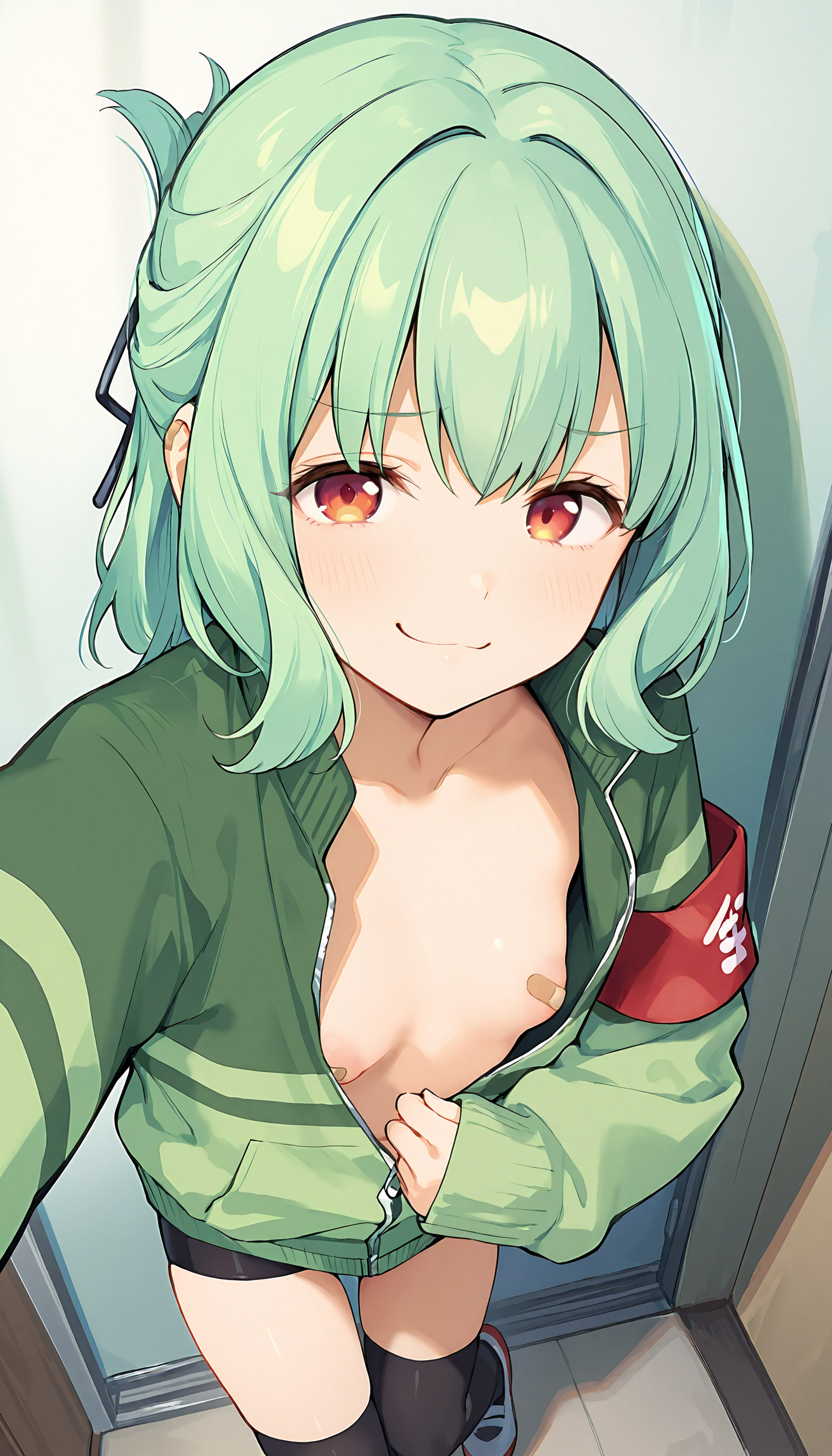 green jacket, armband, naked jacket, long sleeves, open jacket, sleeves past wrists, no bra, hair ribbon, black thighhighs, black shorts, bike shorts, shoes,