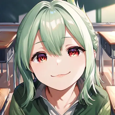 릴리스 버전.프롬프트: 녹색 머리카락, 중간 길이 머리카락, 앞머리, 눈 사이의 머리카락, 접힌 포니테일, 머리카락 흡입, 붉은 눈,