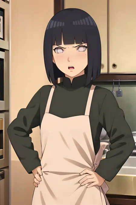 masterpiece, absurdres, hinata(boruto), 1girl, solo, blush, black shirt, apron, looking at viewer, kitchen, smile