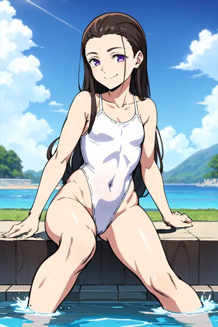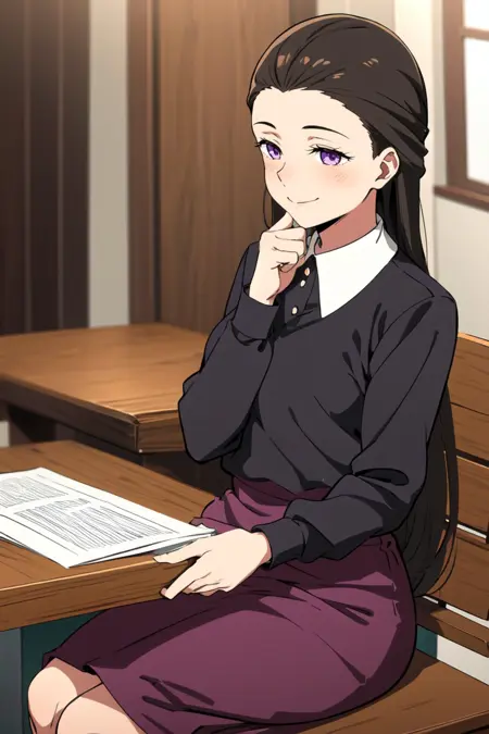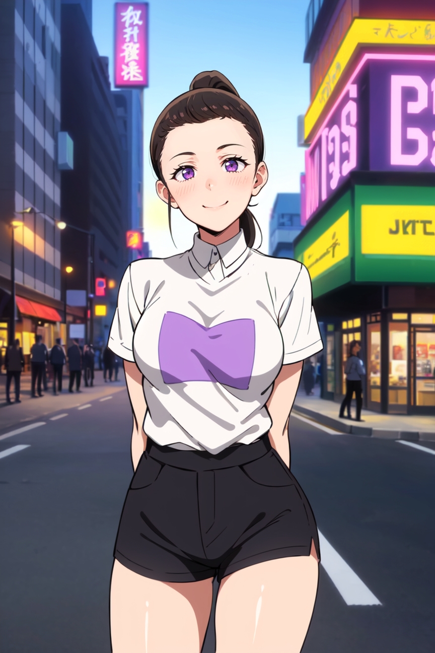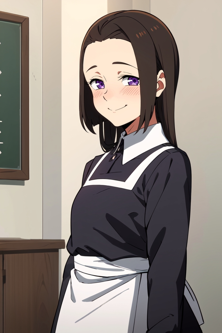 要召唤她,请使用触发标签再加上以下标签:solo, 1girl, black hair, smile, single hair bun, looking at viewer, purple eyes, apron, hair bun, brown hair, maid