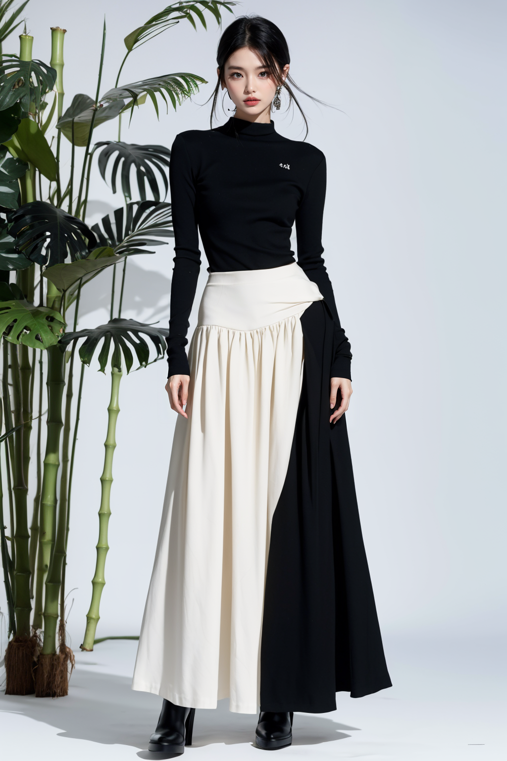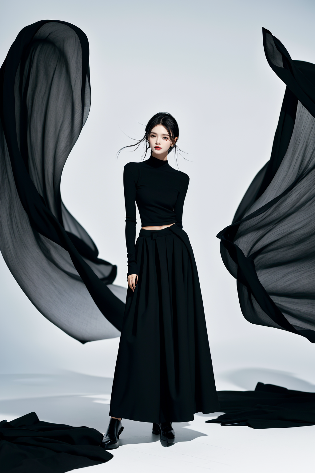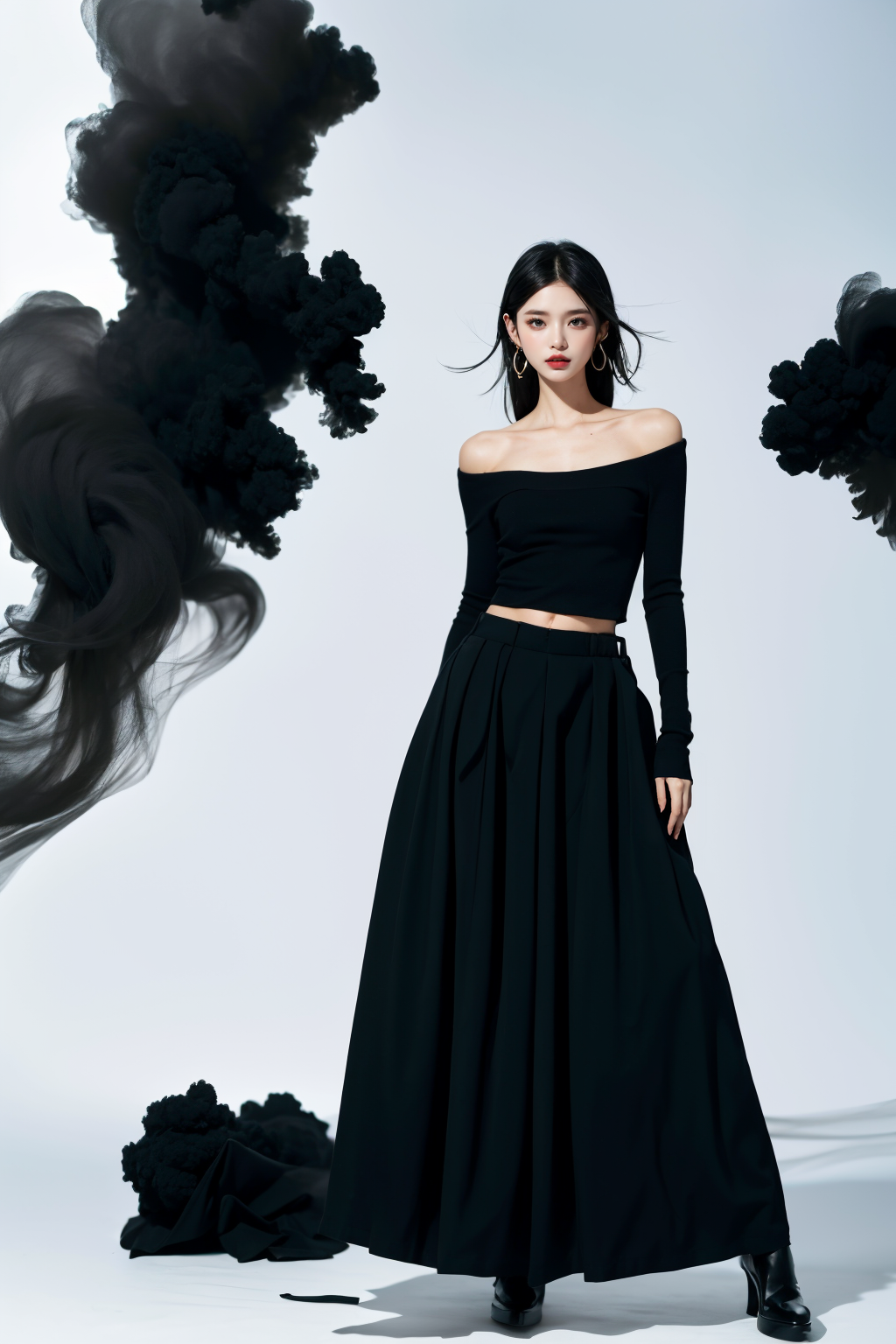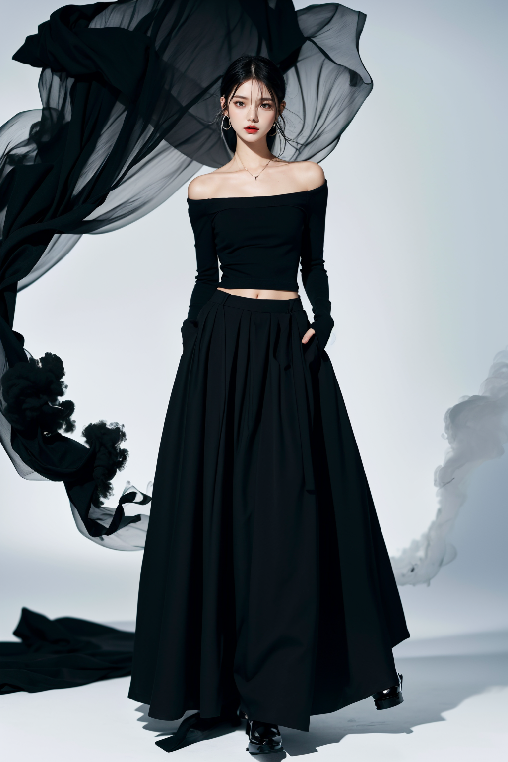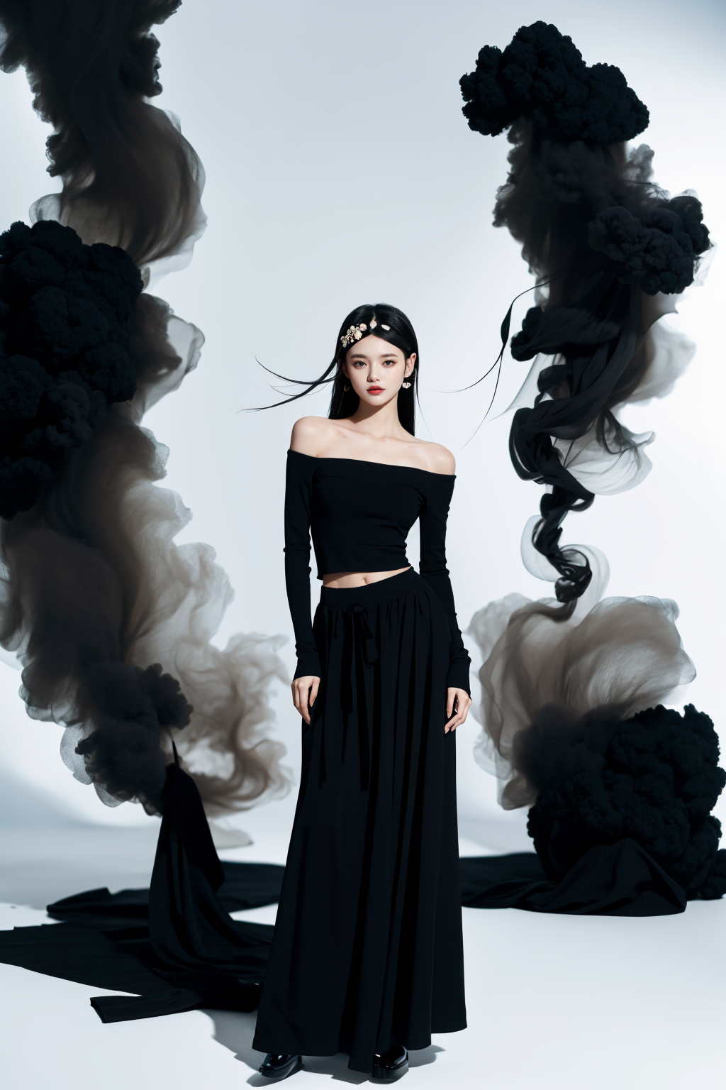 realistic,reality,moying,1girl,solo,looking at viewer,skirt,black hair,hair ornament,long sleeves,white background,dress,standing,full body,black skirt,black shirt,black footwear,black dress,long skirt,((black fabric smoke)), <lora:JAY - MOYING - MẶC ANH:1>, (best quality:1.3)