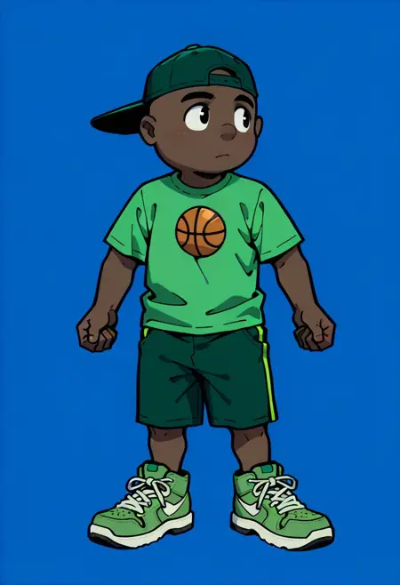 JosephSML, 1boy, Dark skinned male, dark green backward baseball cap, bald, light green T-shirt with a basketball symbol, darker green shorts, light green shoes, black eyes,