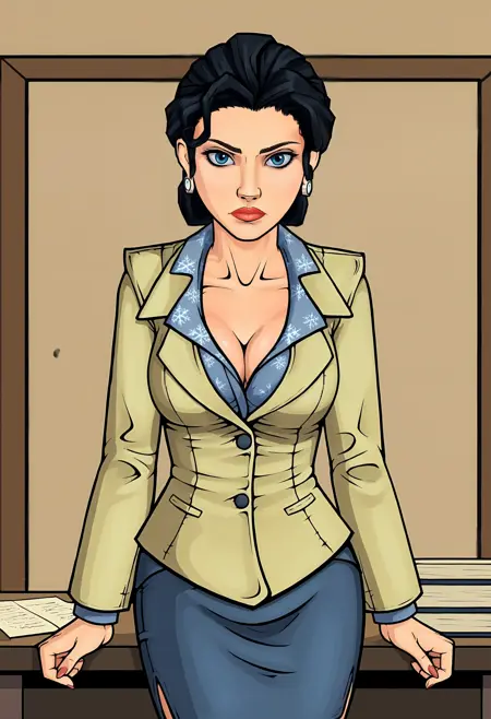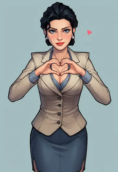 makeup, earrings, jewelry, suit, jacket, cleavage, skirt, pencil skirt, lipstick