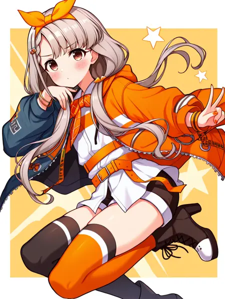 thigh-highs, thighs, white shirt, belt, bowtie, bracelet, hair ribbon, hood, orange jacket,