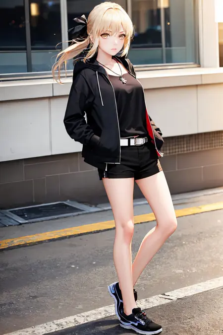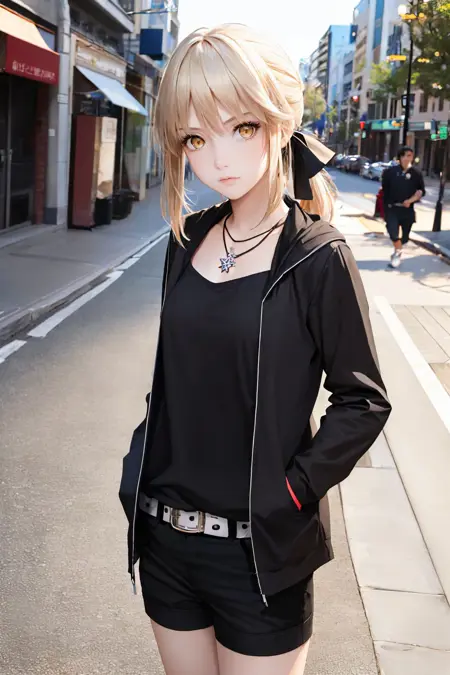ジェットブラック・キング・オブ・ナイト ver., 新宿1999: sabaltblack, long hair, ponytail, hair ribbon, black jacket, black shirt, black shorts, short shorts, belt, jewelry, necklace