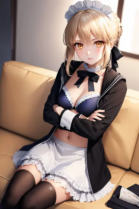 スイムウェア2ndアセンション: sabaltswim, braid, maid headdress, frills, black jacket, open jacket, maid bikini, apron, black thighhighs, bridal garter