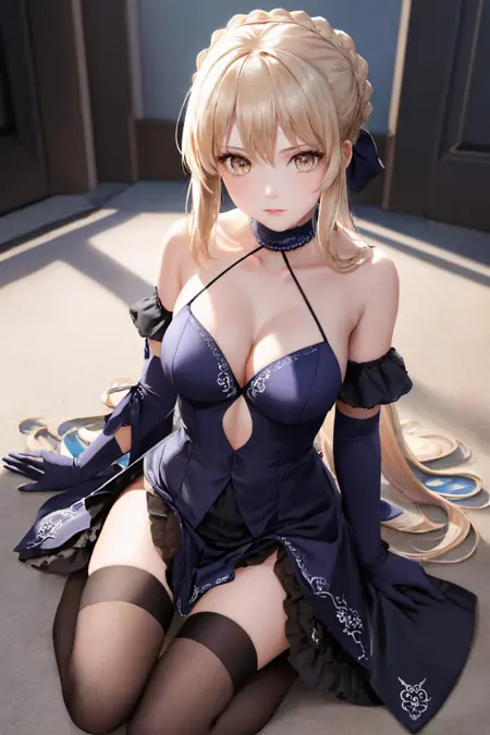 Stage 4: sabaltst4, braid, black dress, black thighhighs, black gloves, elbow gloves, cleavage