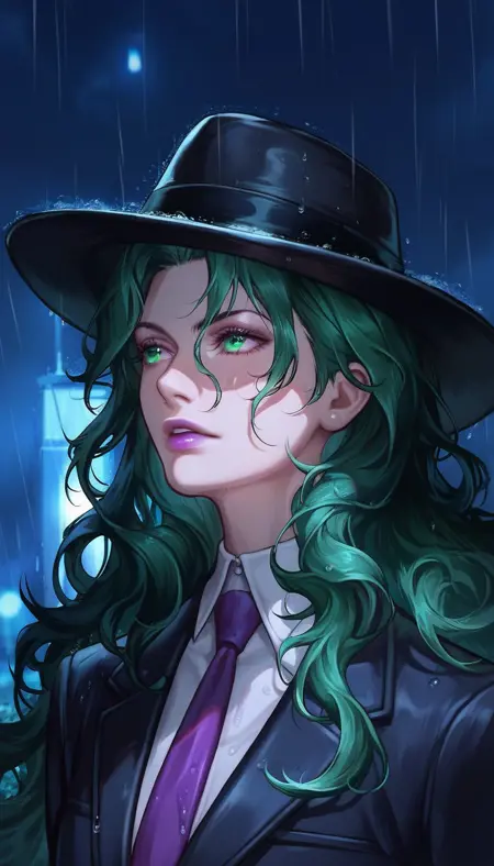 ravenptn,绿色头发,中分刘海,波浪发,长发及地,绿色眼睛,紫色嘴唇,披肩,白色束胸衬衫,黑色紧身裤袜,单侧肘部手套,单侧臂铠,黑色指甲,不对称双臂,长袖,高跟鞋