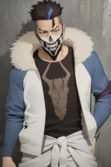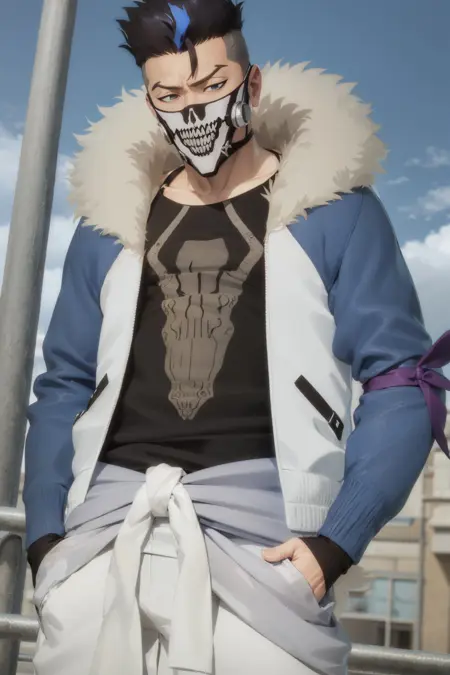 デフォルトの服装: ファーの縁取り、ジャケット、黒いシャツ、パンツ