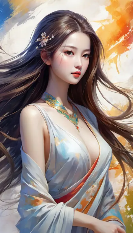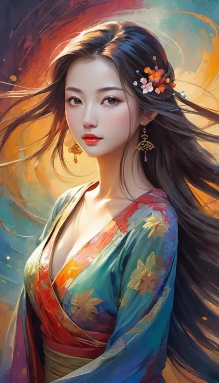 FRESHIDEAS 女孩 16#,(杰作,顶级品质,最佳品质,官方艺术,美丽而美丽:1.2),极其精细,(色彩:1.1),最高细节,(禅意:1.2),(抽象背景:1.3),(多种颜色:1.4),1 个女孩,跳舞,长而柔软的头发,完美比例的面部特征,细腻的肌肤,穿着胸衣,