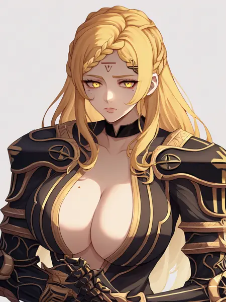 通常タグ: five (drag-on dragoon)、編み込みの前髪、黒いチョーカー、金髪、胸、大きい胸、中央開き、胸元、髪飾り、あり得ない服、ほくろ、目の下のほくろ、黄色い目、肩甲板、ゴールドの縁取り、ガントレット、ゴールドの下着、アーマードブーツ、顔のマーク、額のマーク、ローマ数字