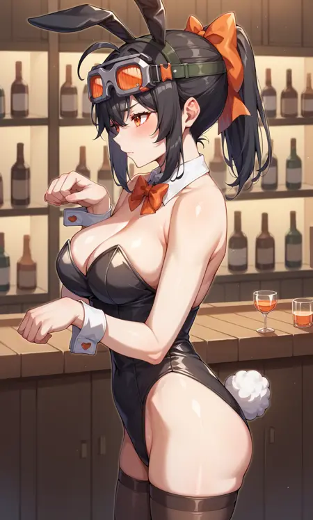 외모: 우아함, 주황색 눈, 검은 머리, 단발, 낮은 토끼꼬리, 아호게