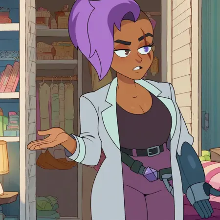 Labcoat, Dark Skinned Female, Purple Hair, Two Tone Hair,