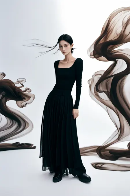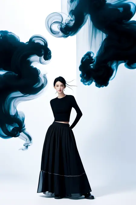 realistic,reality,moying,1girl,solo,looking at viewer,skirt,black hair,hair ornament,long sleeves,white background,dress,standing,full body,black skirt,black shirt,black footwear,black dress,long skirt,((black fabric smoke))