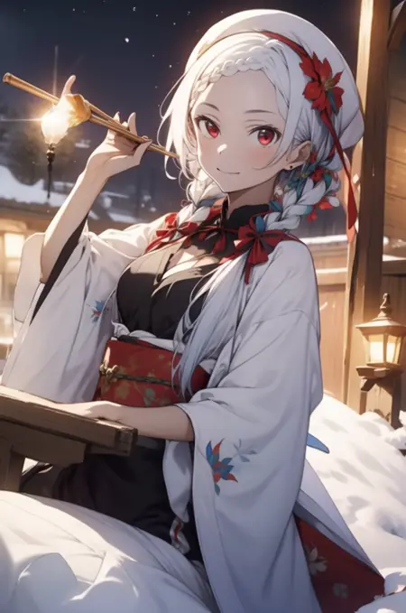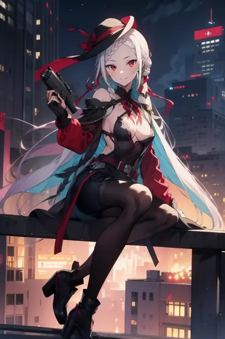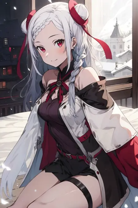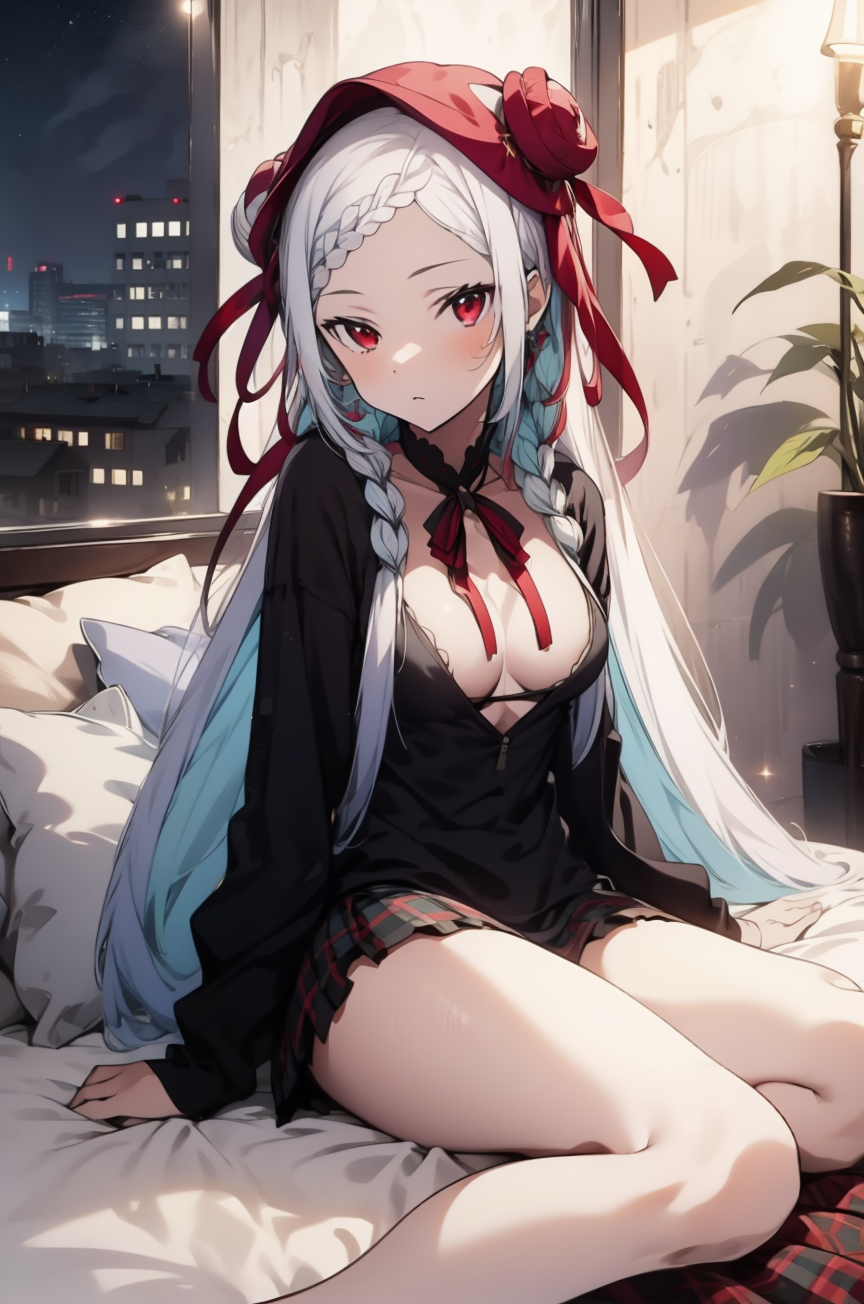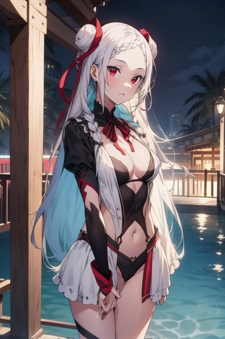 提示:白发,蓝发,双色发,多色发,彩色内发,红眼,乳房,中等大小乳房,丝带,(脖子上系红色丝带:1.1),长发,过肩发,发髻,发带,双髻,辫子,辫子刘海,