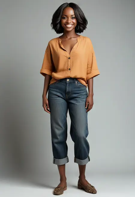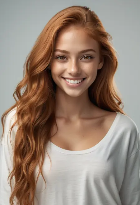 (medium full shot) of young woman, willowy build, medium ginger straight down hair, african, dark skin, black eyes,