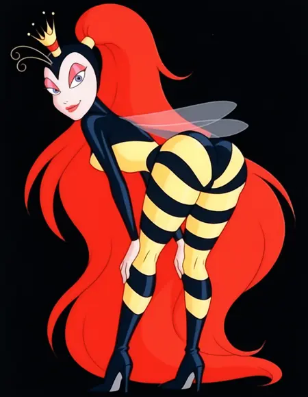 복장: 바디수트, 줄무늬, 부츠, 하이힐, 곤충 날개