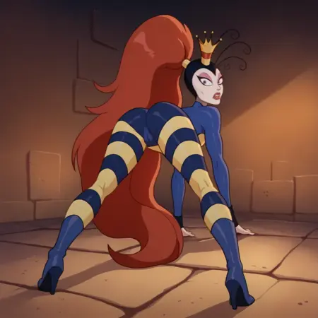 衣装:ボディスーツ、縞模様、ブーツ、ハイヒール、昆虫の羽
