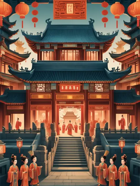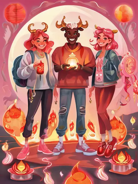 FRESHIDEAS イラスト55番、サイバー、南獅子舞、火、長髪で誰も口を開いておらず、歯が見えていない