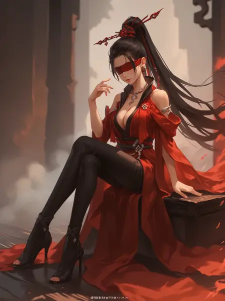 vip3r_ning, 1girl, high ponytail, black hair, very long hair, black hair, hair ornament, red robe, bare shoulders, blindfold, cleavage, heels,