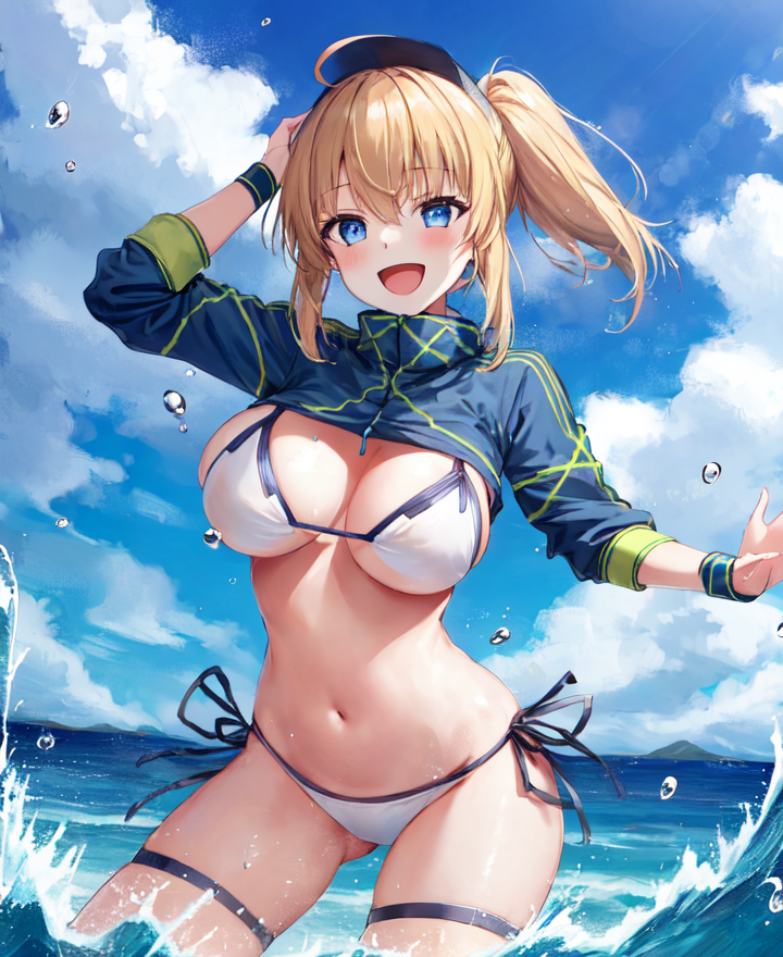 **第三再臨:**baseball cap, blue headwear, hair through headwear, swimsuit, white bikini, side-tie bikini bottom, shrug \(clothing\), jacket, thigh strap, wristband,