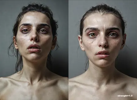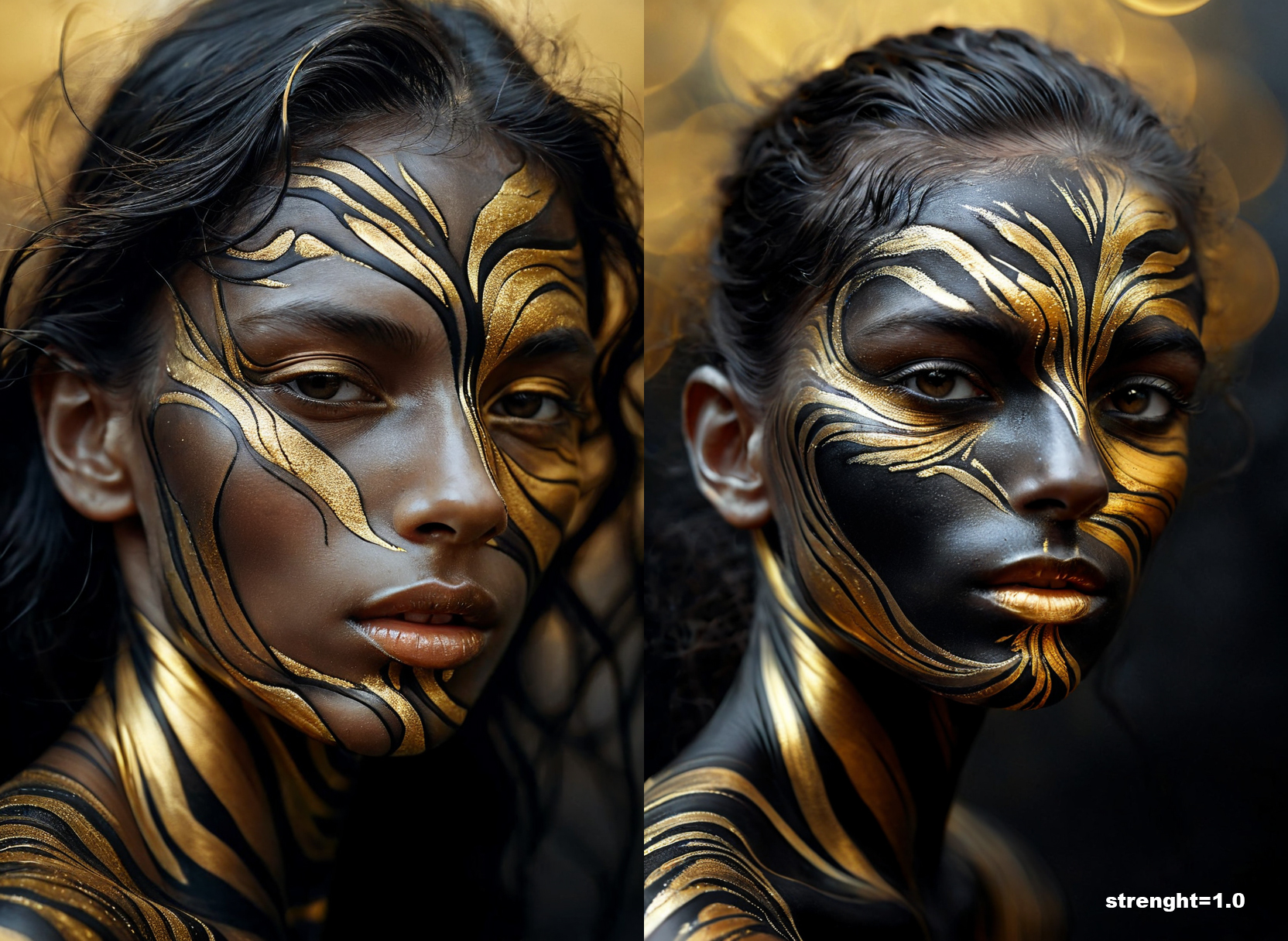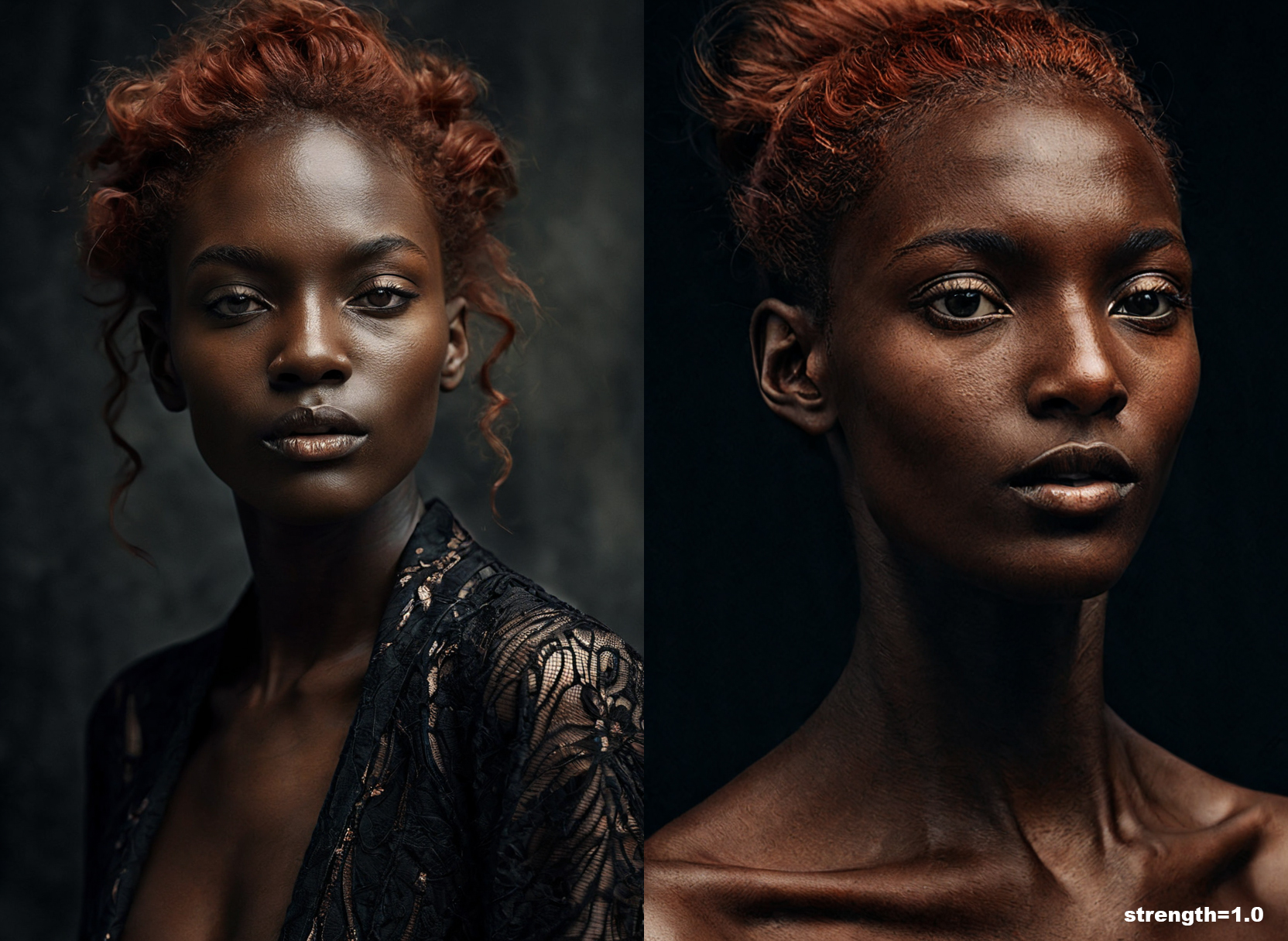 강도를 1 이상으로 높이거나, 음수로 설정하면 더욱 뚜렷하고 종종 놀라운 효과를 얻을 수 있습니다. 강도 > 1을 사용하면 더 고급스러운 룩을, 강도 < 0을 사용하면 더 사실적인 룩을 얻을 수 있습니다.