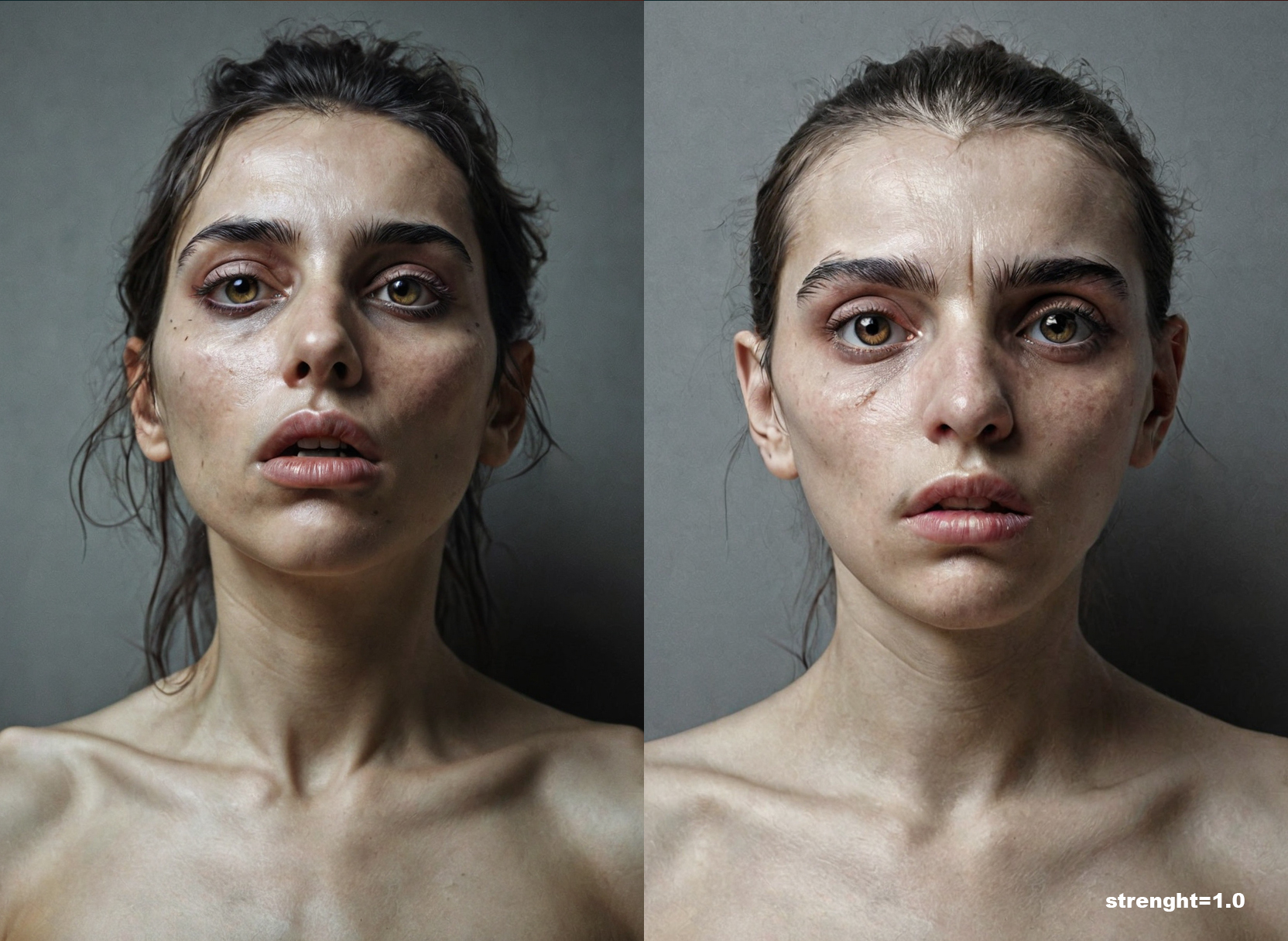 이 LoRA는 기본 Flux1 얼굴(대부분 여전히 지나치게 고정된 스테레오타입적인 경향이 있음)에 약간의 사실성을 부여하기 위해 0.1–0.3 강도로 사용하거나, 1.0 강도까지 사용하여 더 고급스러운 룩을 만들어내기 위한 목적이 있습니다.