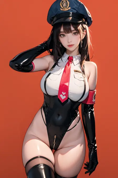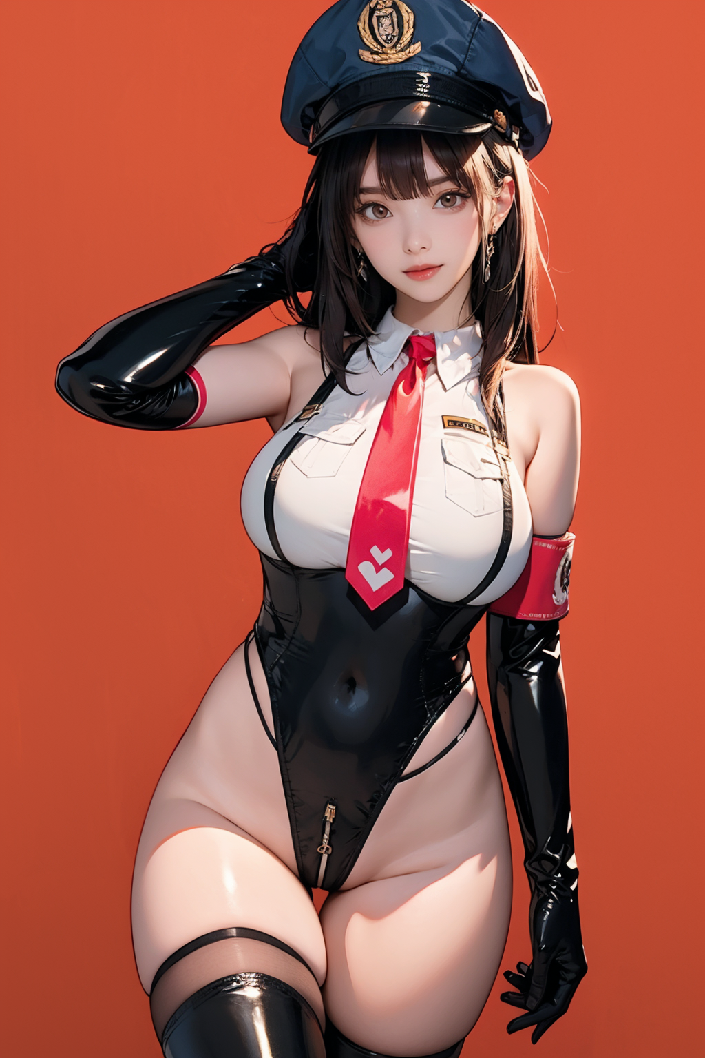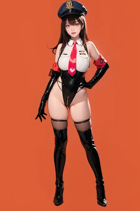 elbow gloves,armband,collared shirt,leotard,necktie,peaked cap,thigh boots