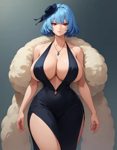"titandres, red eyes, black dress, jewelry, short hair, cleavage, sideboob, feather boa, small hat, black headwear necklace, cowboy shot, sitting,oiled skin,shiny skin,indoors,casino,hand rest, table,smirk"
