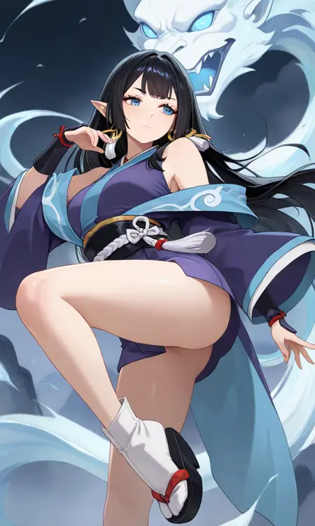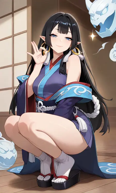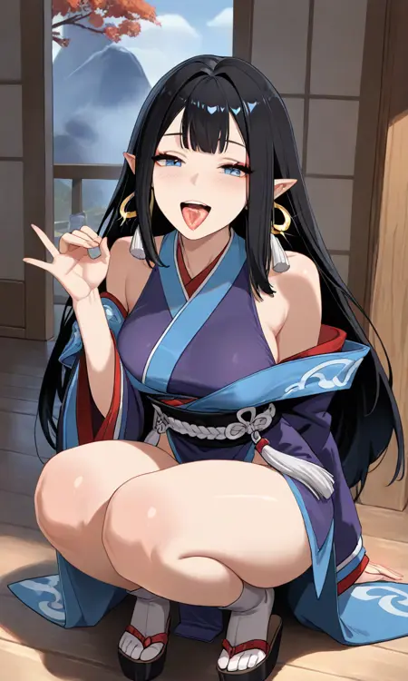 Enenra, blue eyes, long hair, black hair, bang, japanese clothes, purple kimono, detached sleeves, wide sleeves, bare shoulders, golden earrings, slightly pointy ears, white rope, tabi