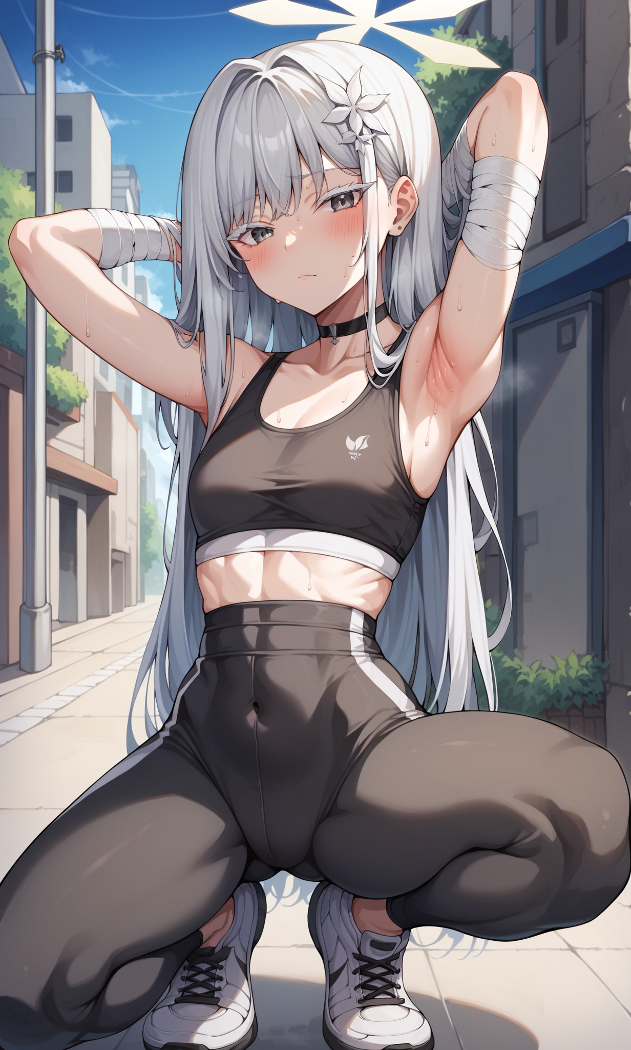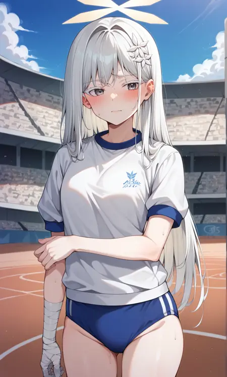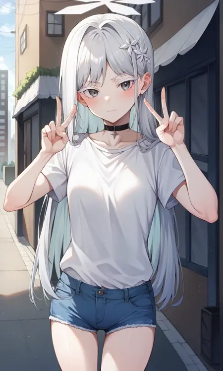 appearance: nagusa, grey eyes, colored eyelashes, pale skin, white hair, long hair, hair ornament, halo