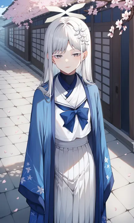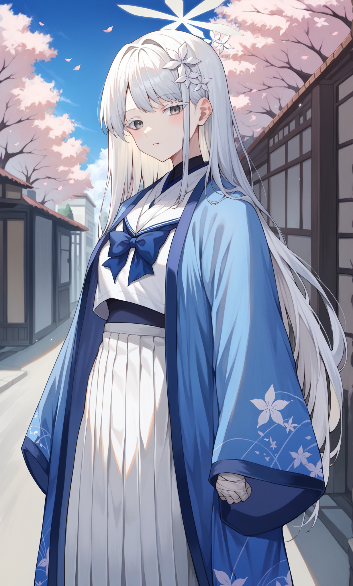 outfit: blue haori, wide sleeves, floral print, kimono on shoulders, white shirt, white serafuku, blue bowtie, bandaged arm, bandage, white skirt, pleated skirt, long skirt, white socks, sandals, geta
