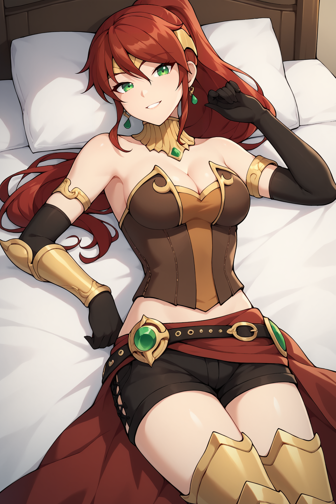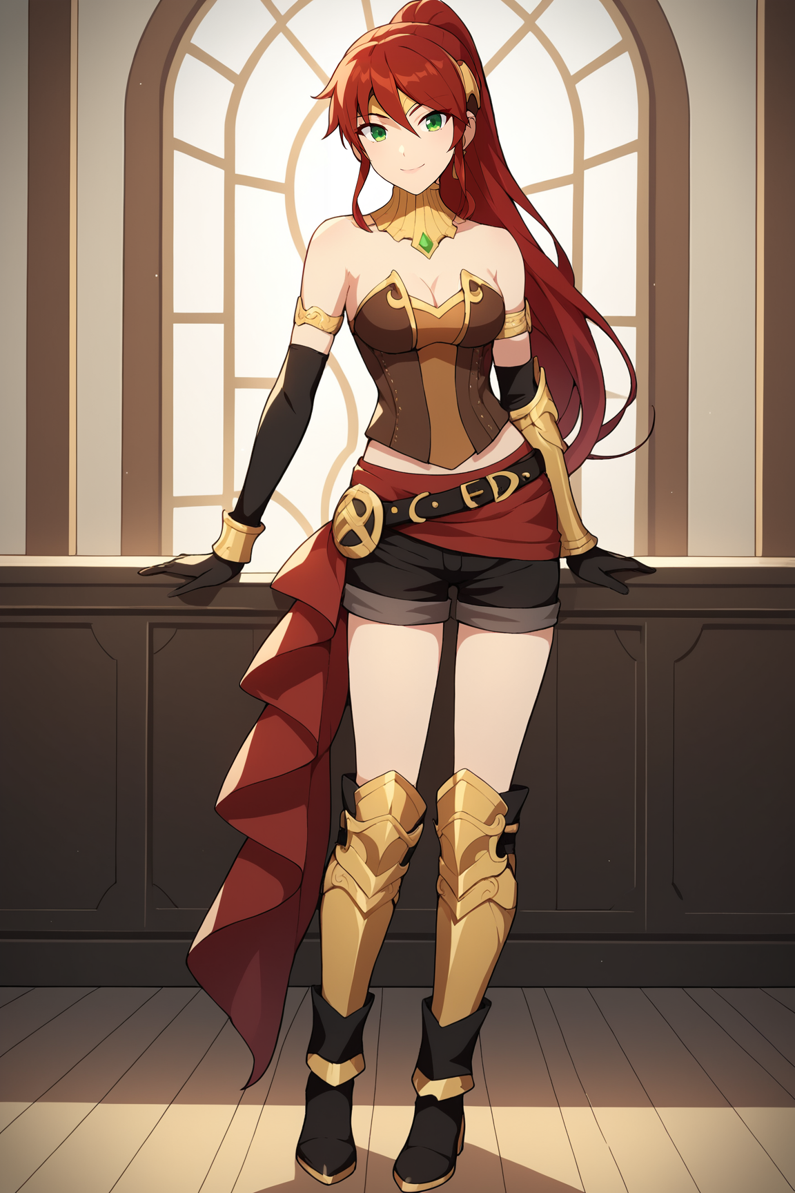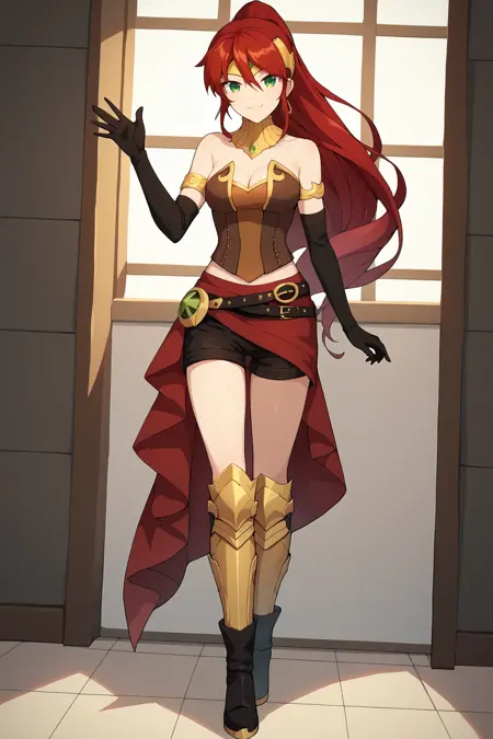 ➜ PyrrhaNikosXL, 녹색 눈, 빨간 머리, 긴 머리, 언더핀, 눈 사이의 머리, 이마 보호대, 중간 크기의 가슴, 드러난 어깨, 금색 흉갑, 가슴 사이의 틈, 갈색 코르셋, 금색 팔찌, 검은 팔꿈치 장갑, 단일 판정, 검은 벨트, 검은 쇼츠, 빨간 치마, 다리 갑옷, 검은 부츠